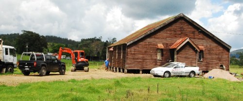 Above, our Builder, Murray Pearson (on left) with the re-stumper Mick Bielby kneeling. Murray is from Maleny, has met the expectations of the Management Committee, and shown himself to be equal to the problems encountered so far with this unique project. Mick Bielby has some association with the hall renovation having – as a result of enquiries from various hall management committees from 1995 onward – made many quotes for re-stumping of the hall, to each of which he responded with good grace.
