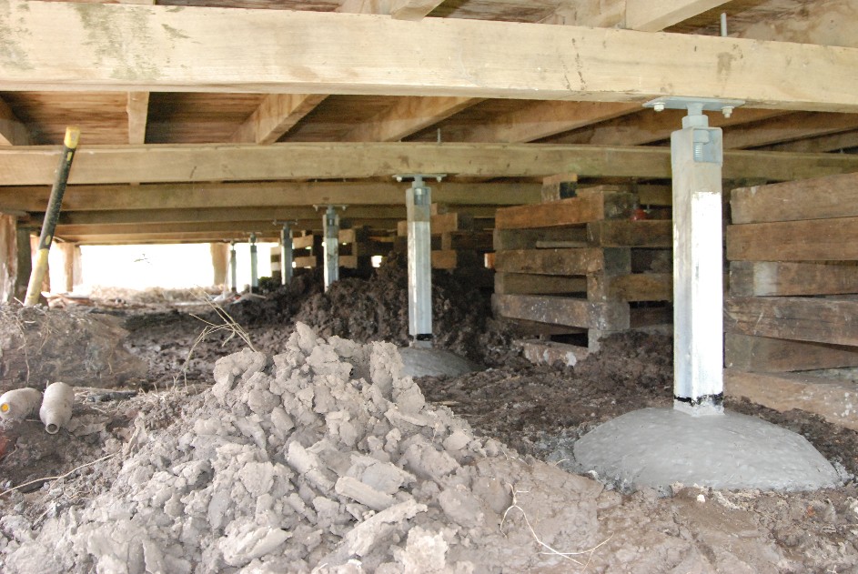 In spite of wet weather and very boggy conditions under the hall (in some parts puddles), at times requiring the use of a pump to drain dug holes, Mick Bielby and assistant, using minimal tools and manual labour, is presently replacing the stumps under the interior of the hall with height adjustable steel footings set in concrete 900 mm into the ground. Due to the high clay content in the soil under the hall, vertical movement of the footings may result requiring the use of the height adjusters to maintain a level floor. Hardwood external stumps will be used for the external footings where possible.