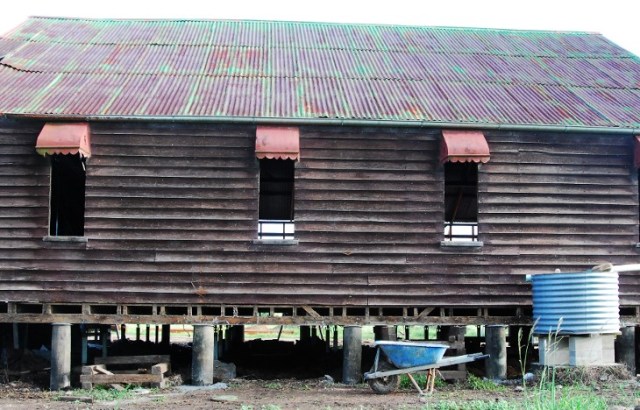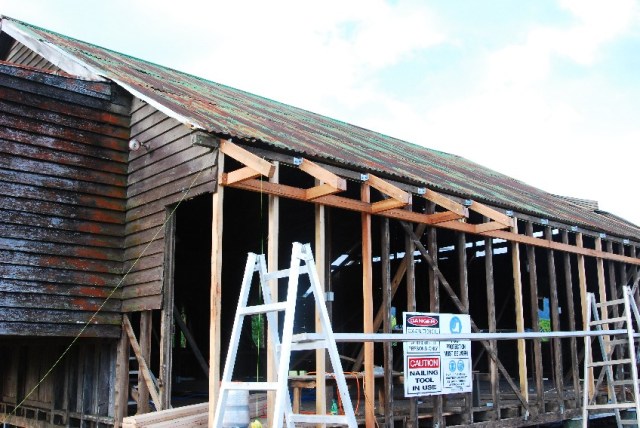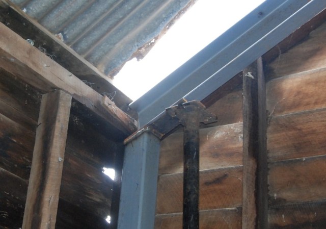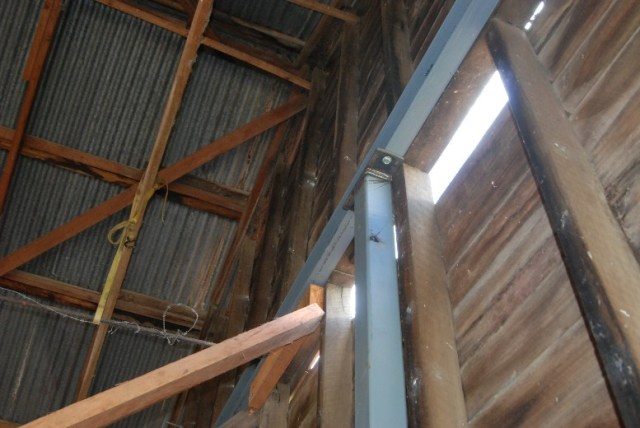 The front wall looking up at part the steel portal frame which extends the full width of the hall and down to the footings, with two beams up high bracing each side of the portal frame to the stage wall