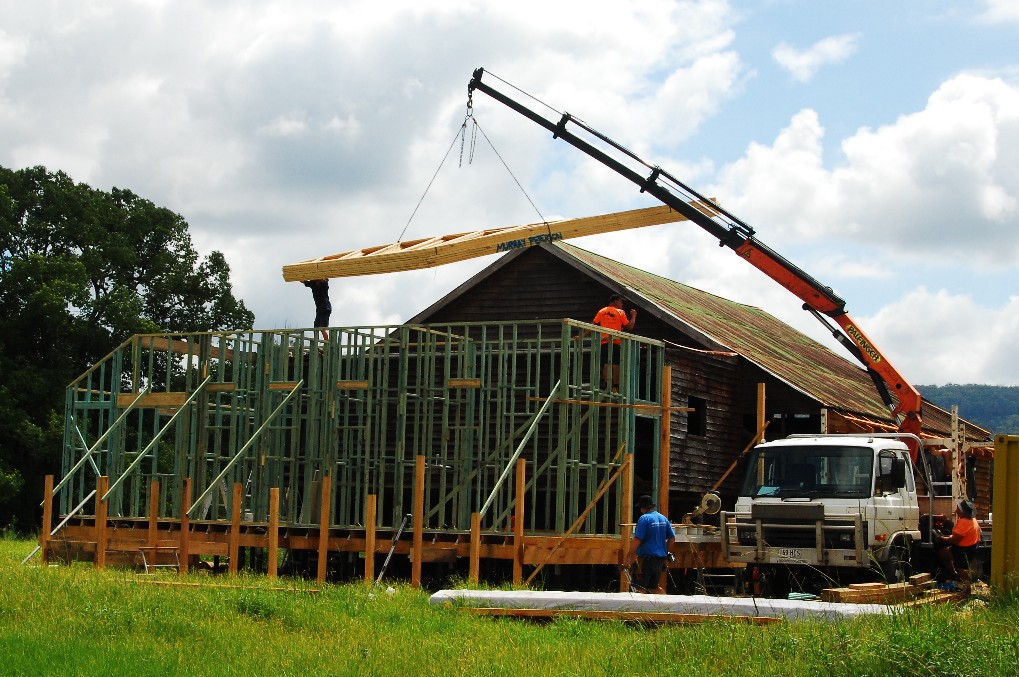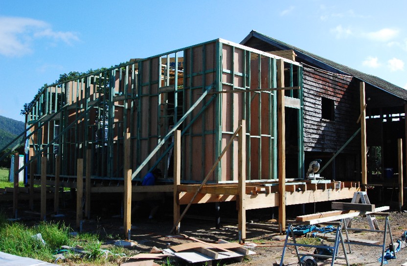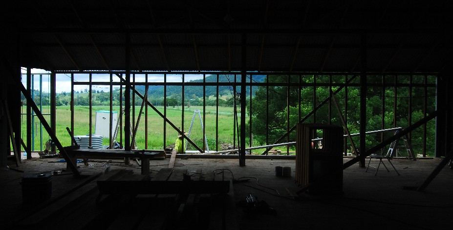Cladding the kitchen wall on the north side of the hall. The plastic sheeting covers the window frames to protect them from rain while being painted.
