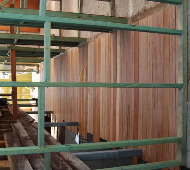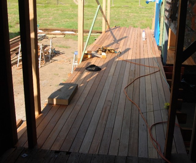 The toilet hallway looking from the kitchen end, constructed with same decking boards as the rest of the external flooring.
