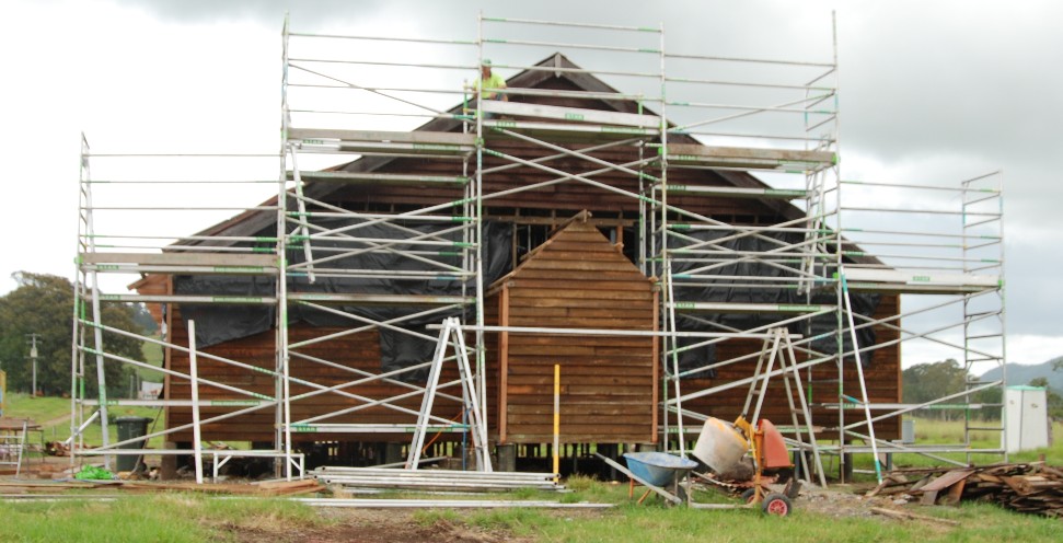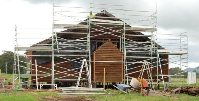 The scaffolding, a complex construction, took some time to erect by scaffolding specialists.