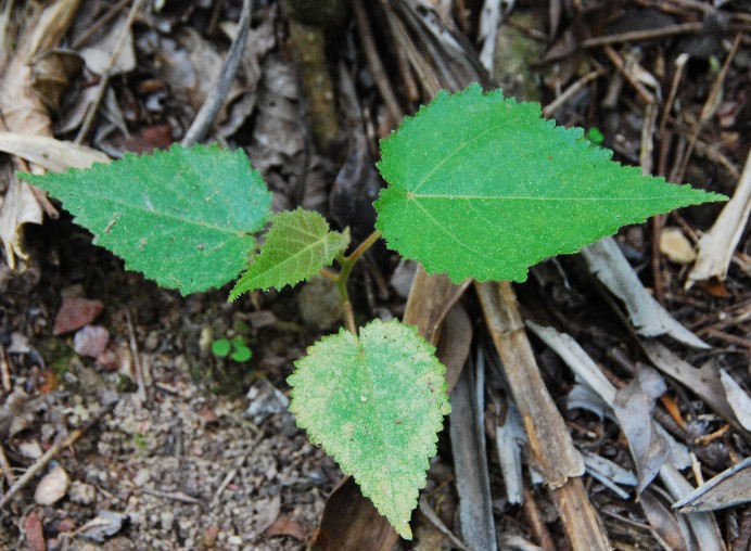 Found in my garden, probably a baby Giant Stinger tree – dendrocnide excelsa – which can grow to 40 m tall into a typical buttressed soft wood rain forest tree, its mullberry like fruits are eaten and then spread by birds.