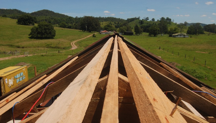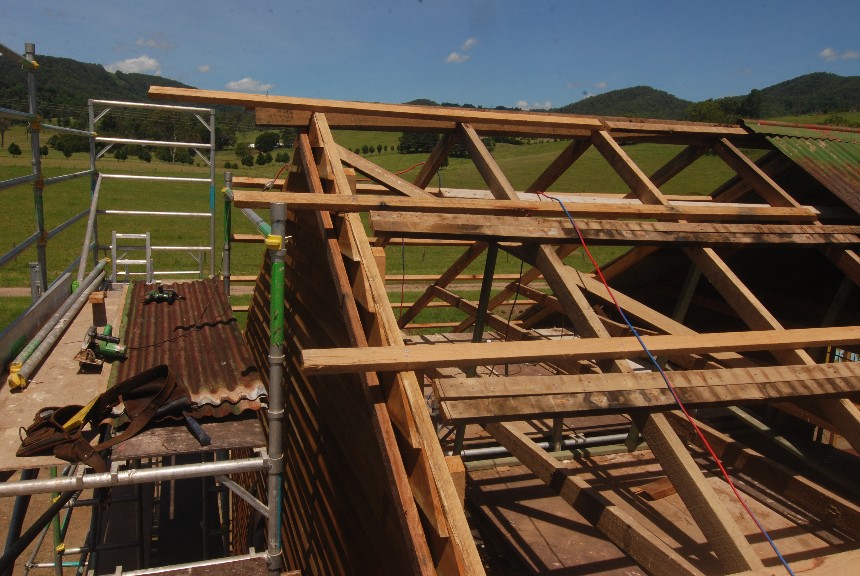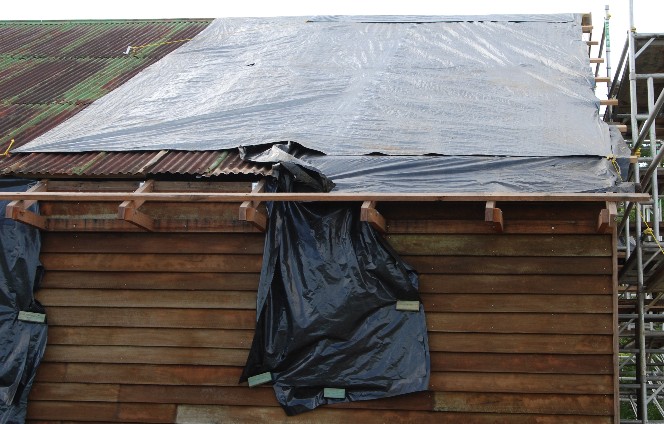 Working on the roof, with various rafters and batterns replaced.