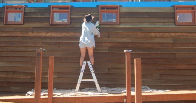 Preparing the weatherboards for painting by cleaning with wire brushes.