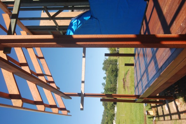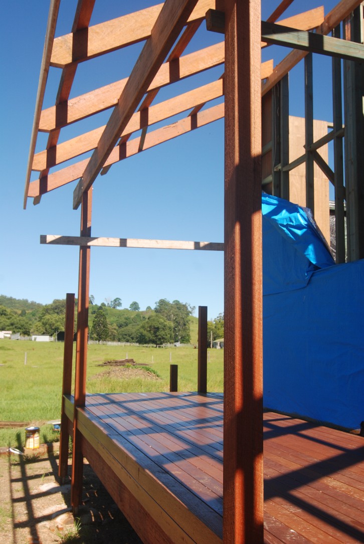 Extending the roof over the entrance deck. All exposed beams have been pre-painted.