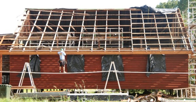 The start of the new roof over the stage.