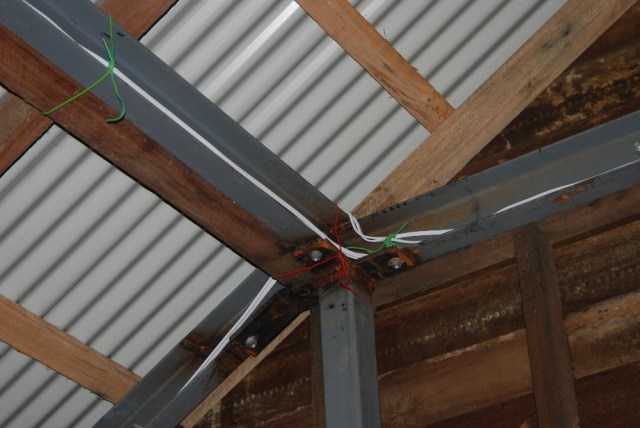 Electricial wiring being installed inside the portal frame which will be covered by a timber cladding. Viewed at the junction of roof and front wall on north side of hall.