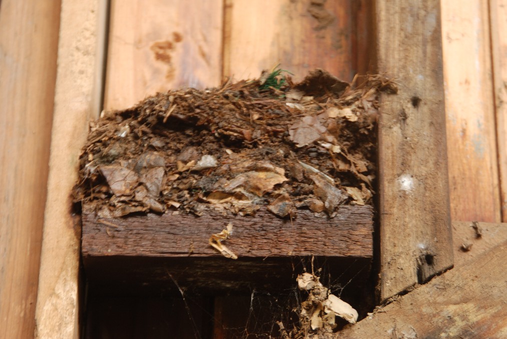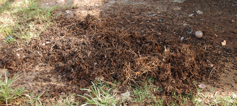 Taken from the ceiling above the stage, three buckets of a combination of rat droppings, grass and straw.