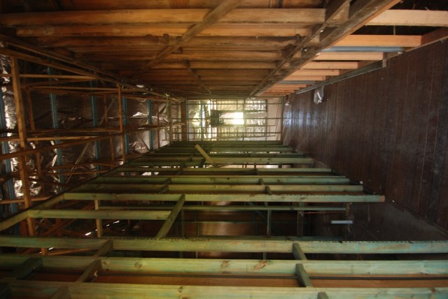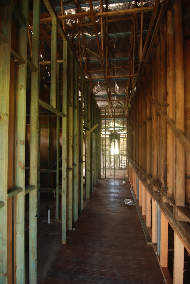 From the deck, showing the hallway to the toilets, with the unlined rear of the stage on the right, and a window on the kitchen wall at the rear.