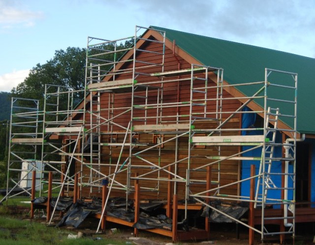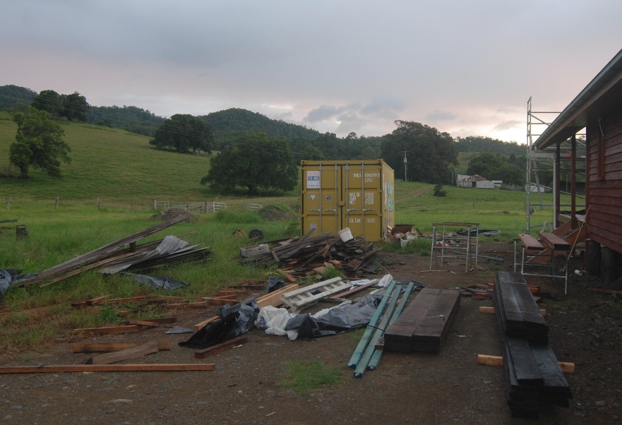 The southern side of the hall has been the builder’s main work area with the builder’s storage container at the rear and the hall entrance deck on the right.