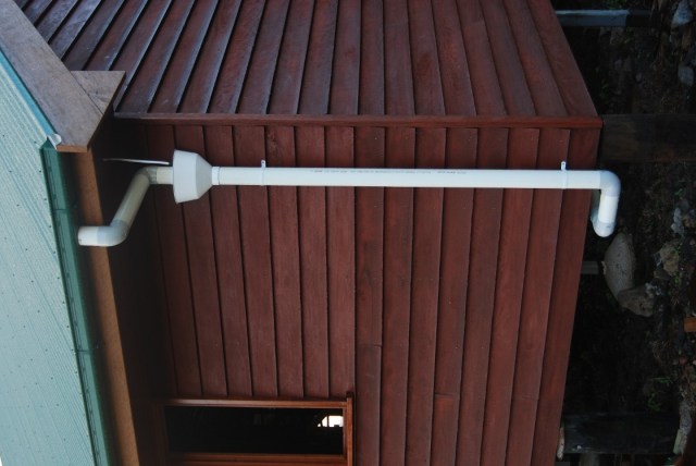Council regulations state: when tank water is used for drinking, leaf eaters are required to filter the water. The white power cable dangling beside the leafeater is for an external spotlight. The front southern corner of the hall.