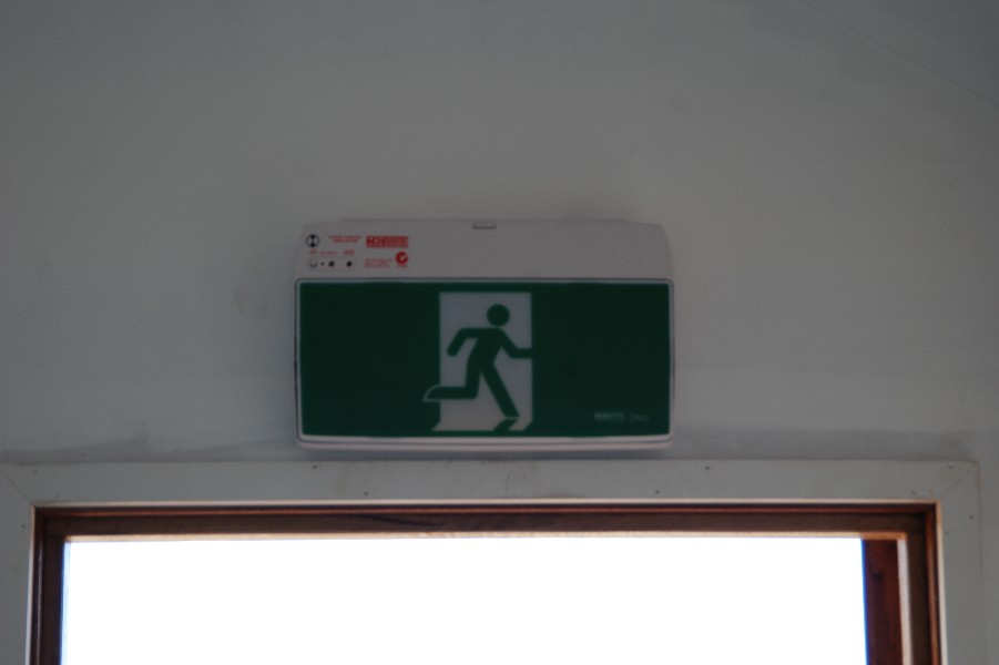 Fire safety, an illuminated emergency exit sign above the external kitchen door. All external doors will have these electrically powered signs.