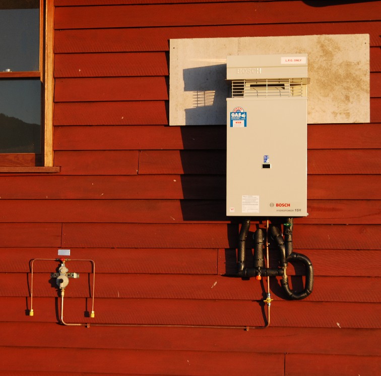 The  white sheeting behind the hot water system is a temporary heat shield for the wood cladding, it will be replaced with a permanent heat shield.