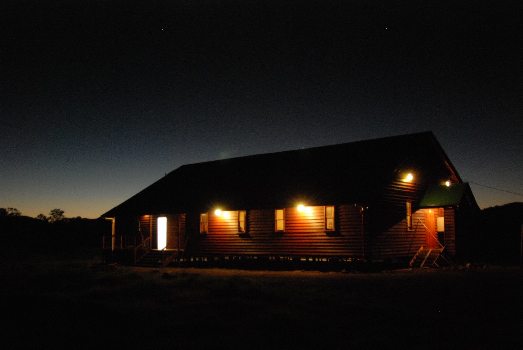The faint glow seen inside the hall at night comes from the five emergency exit lights (each drawing 5 watts of electricity) which remain on at all times.