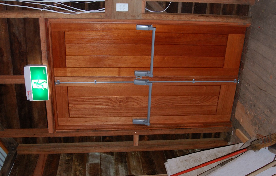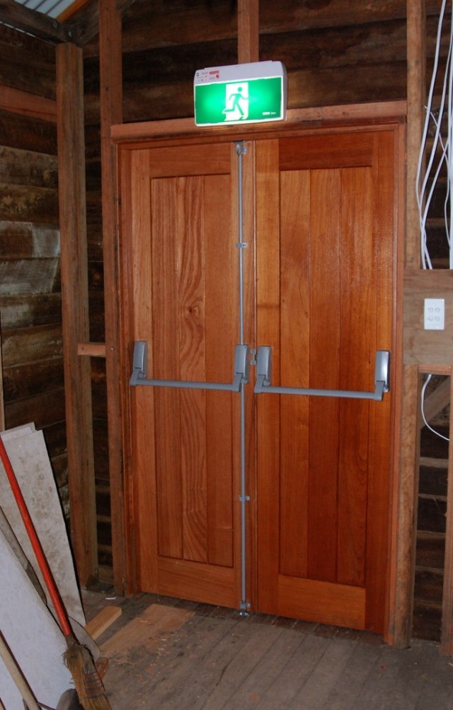 If double doors are more than 820 mm wide, a panic bar is only required on one door. Our doors are 600 mm wide, so require two panic bars.