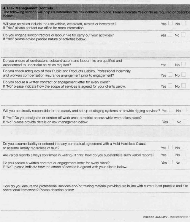 Below is a section of an Entertainment Proposal form which requests information to allow the insurer to set an insurance premium for an event.