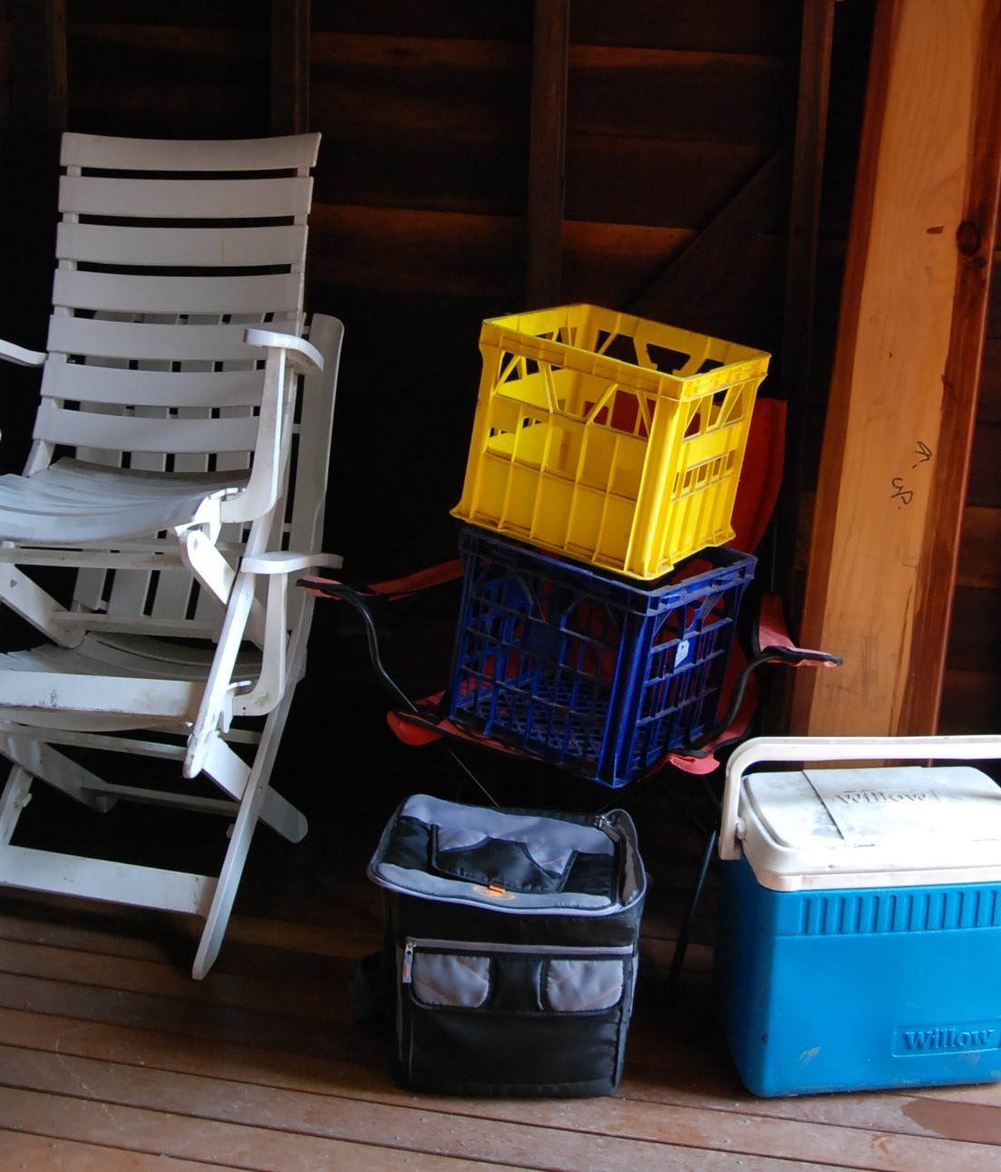 These items were left at the hall. Two folding white plastic chairs, one red canvas folding chair, one blue and white eskie, one blue soft eskie bag, two plastic crates and one wood plank. The items are presently stored in the front door entry.