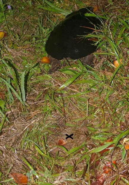 Leaving after camouflaging the nest, X marks the nesting site.