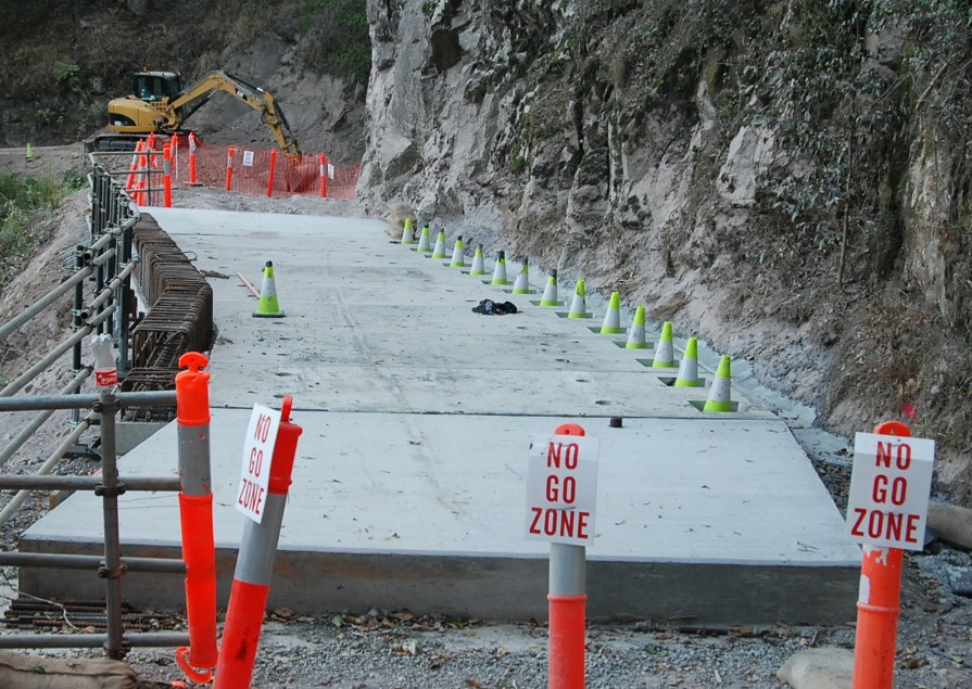 The concrete pad is anchored by rods extending down into the rock shelf below.