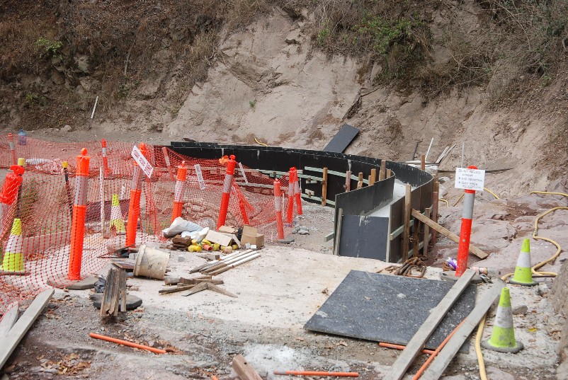 The start of a re-enforced concrete slab roadway supported on concrete piles drilled into the rock below, with a concrete retaining wall on the outside edge.