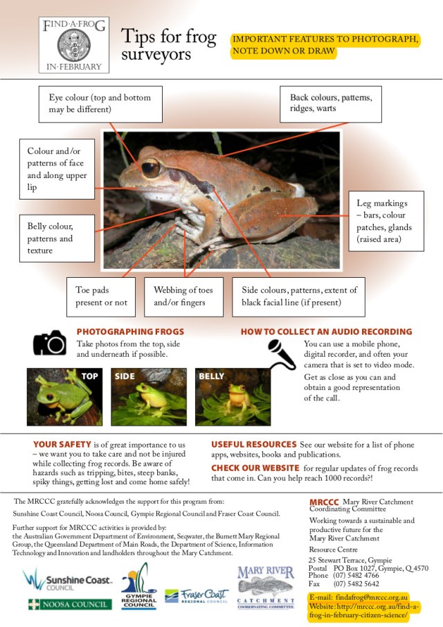 Eva Ford, Catchment Officer with the Mary River Catchment Coordinating Committee, is asking all landholders in the Obi and Kidaman Creek communities to contribute to the Find a Frog in February citizen science program. This information is accessed by all sorts of people and agencies for planning, research, development applications, general interest. This is how you can make a difference to the future good management of our native species and their habitats.