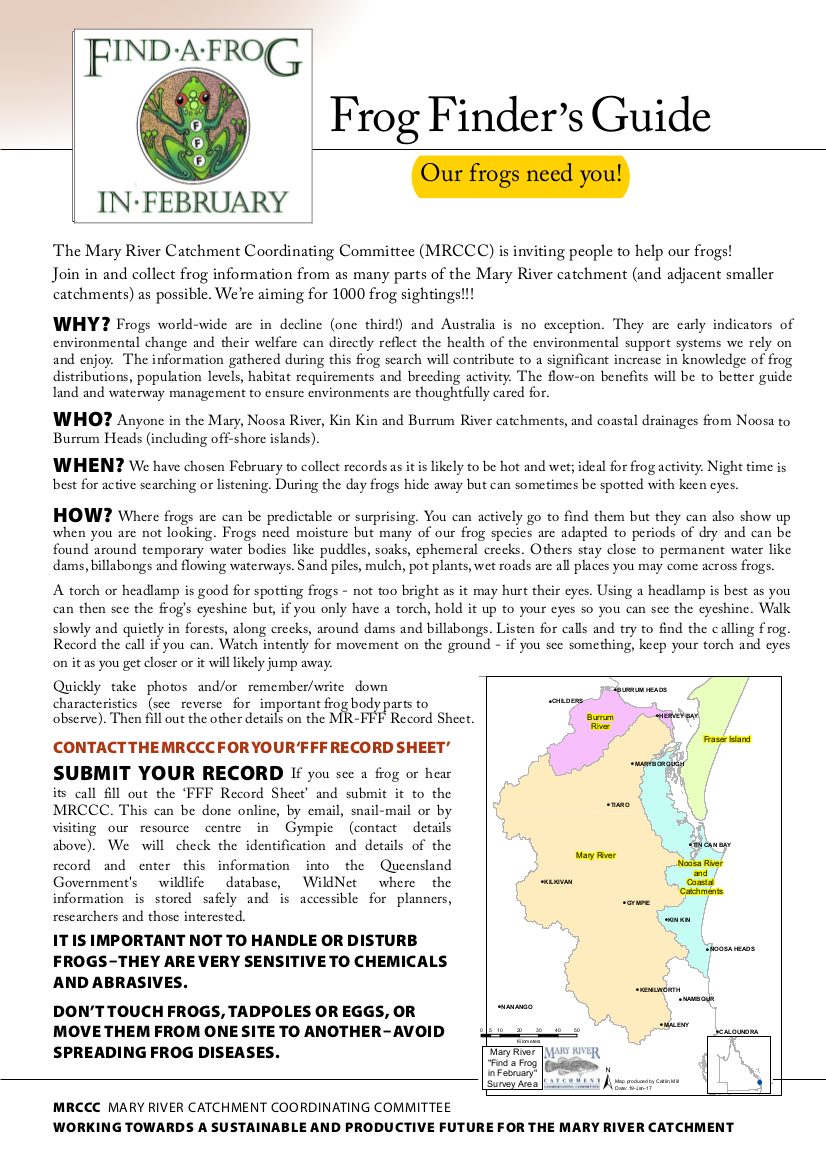 Eva Ford, Catchment Officer with the Mary River Catchment Coordinating Committee, is asking all landholders in the Obi and Kidaman Creek communities to contribute to the Find a Frog in February citizen science program. This information is accessed by all sorts of people and agencies for planning, research, development applications, general interest. This is how you can make a difference to the future good management of our native species and their habitats.