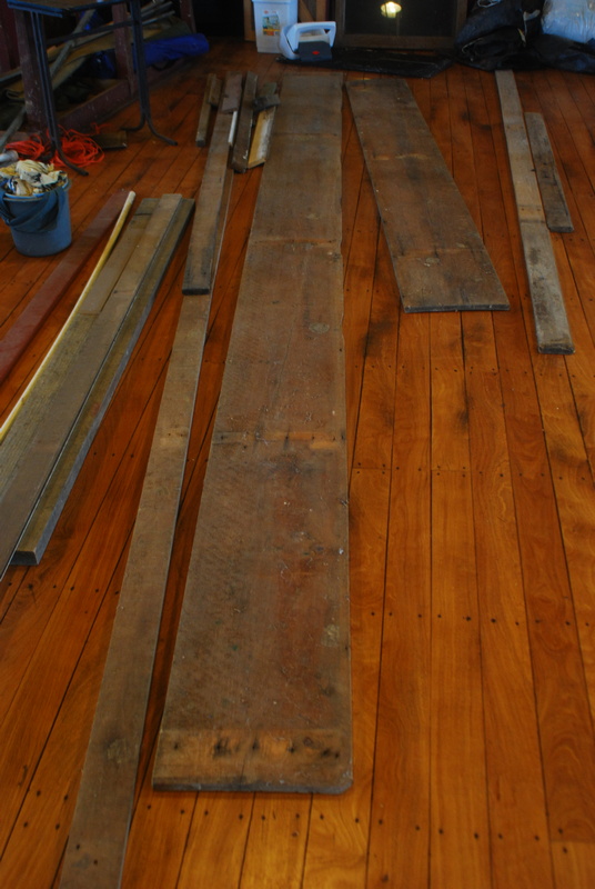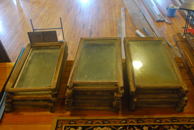 Above, windows, doors and other materials replaced during the hall’s renovation were stored under the stage, now they have to go