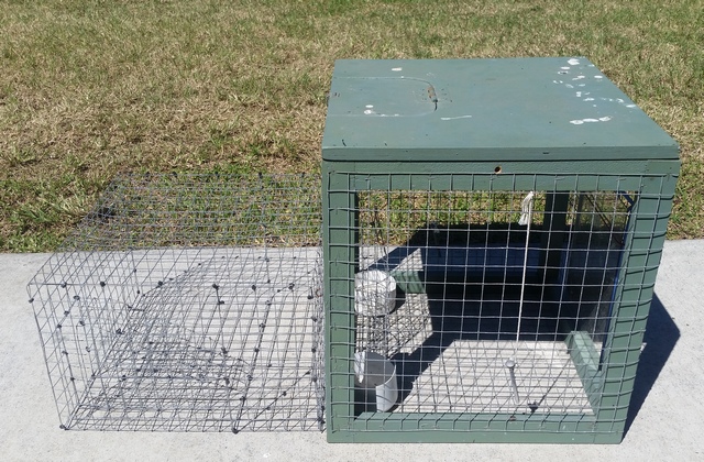 Myna birds enter from the left side of the trap through an opening designed for access but not exit, they are attracted by dry cat food in the left wire enclosure