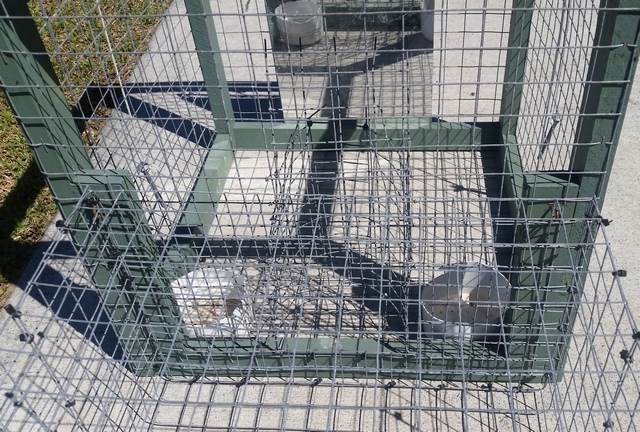 Myna birds enter from the left side of the trap through an opening designed for access but not exit, they are attracted by dry cat food in the left wire enclosure