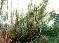 Native to Africa. This grass is spreading down the range section of the Obi Obi Rd towards the Obi Obi Valley. Forms bamboo-like (4 metre high), densely tufted clumps that invades bushland vegetation