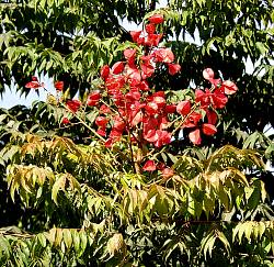Rhus has many fertile seeds which are liked by birds. Native to Asia. This small tree produces a skin irritating oil called Urushiol which can give a severe allergic reaction upon contact.